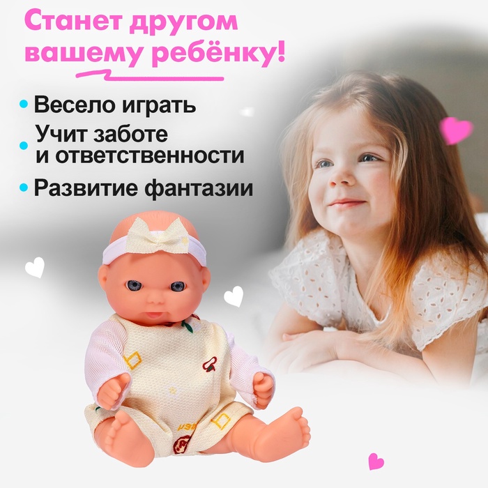 Представляем вашему вниманию очаровательного пупса «Милый малыш». Этот маленький друг станет отличным компаньоном для игр. Пупс выполнен из мягких и приятных на ощупь материалов.