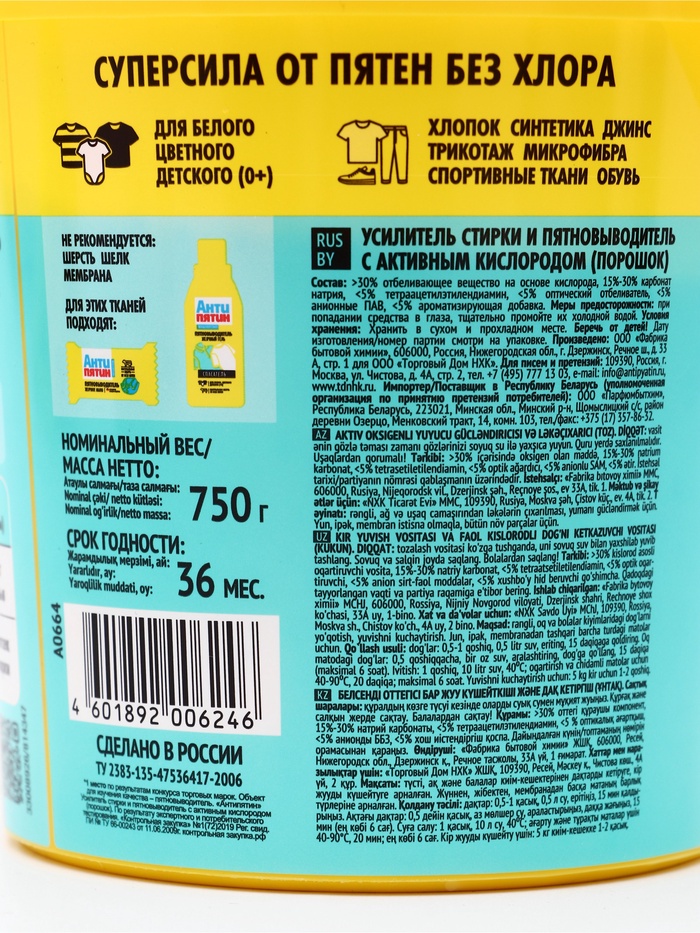 Состав: 30% отбеливающее вещество на основе кислорода, 15%-30% карбонат натрия, <5% тетраацетилэтилендиамин, <5% оптический отбеливатель, <5% анионные ПАВ, <5% ароматизирующая добавка.