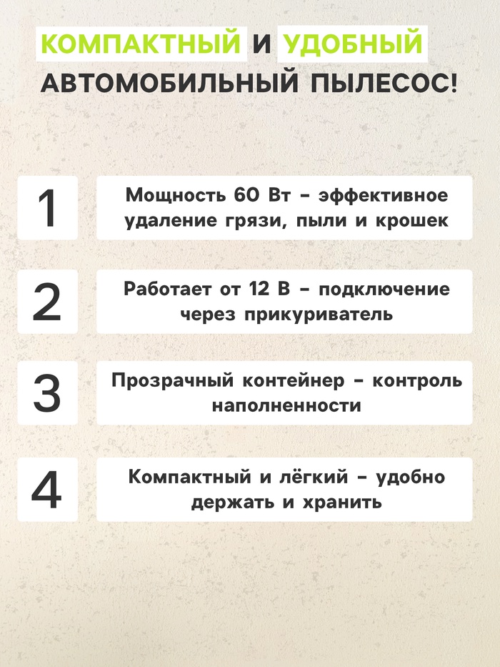 - Мощность 60 Вт позволяет собрать пыль, песок, пепел даже из самых труднодоступных мест салона.