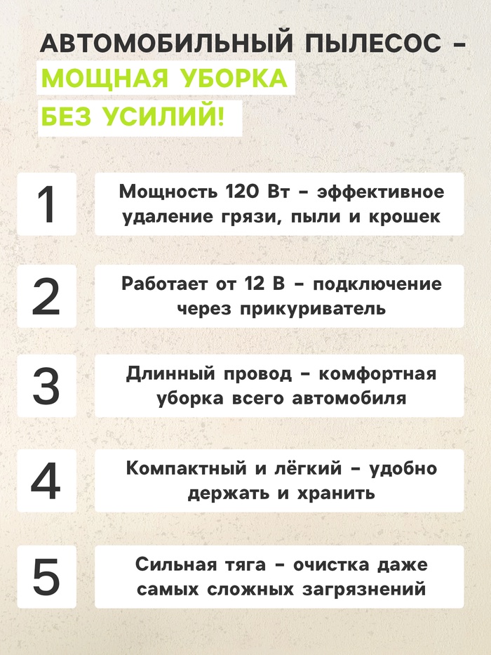 Пылесос автомобильный CARTAGE идеален для уборки салона автомобиля. Мощность 140 Вт и 5 универсальных насадок позволяют собрать пыль, песок, пепел даже из самых труднодоступных мест салона. Питание от бортовой электросети легкового автомобиля 12 В позволяет пользоваться пылесосом в любом удобном для вас месте. Компактный размер позволяет хранить пылесос в багажнике автомобиля.