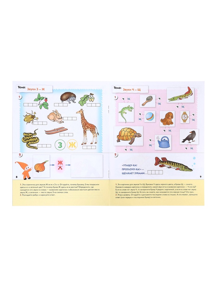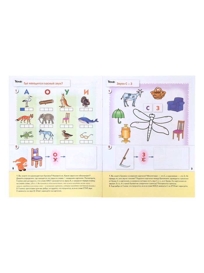 Выполняя задания из рабочей тетради, дошкольники повторяют уже знакомые им гласные звуки, учатся различать согласные, определять, с какого звука начинается слово, знакомятся с твёрдыми и мягкими звуками.