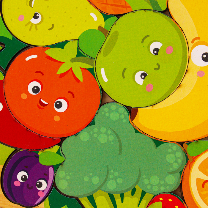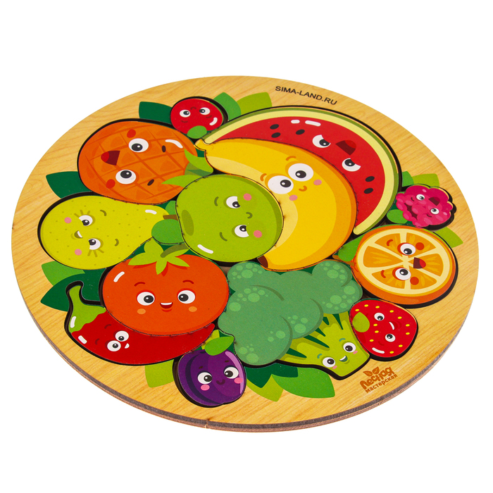 Необычная головоломка и сочетает в себе пазл и рамку-вкладыш. Задача крохи — правильно разместить красочные фигурки на деревянном основании, чтобы получилась цельная картинка.