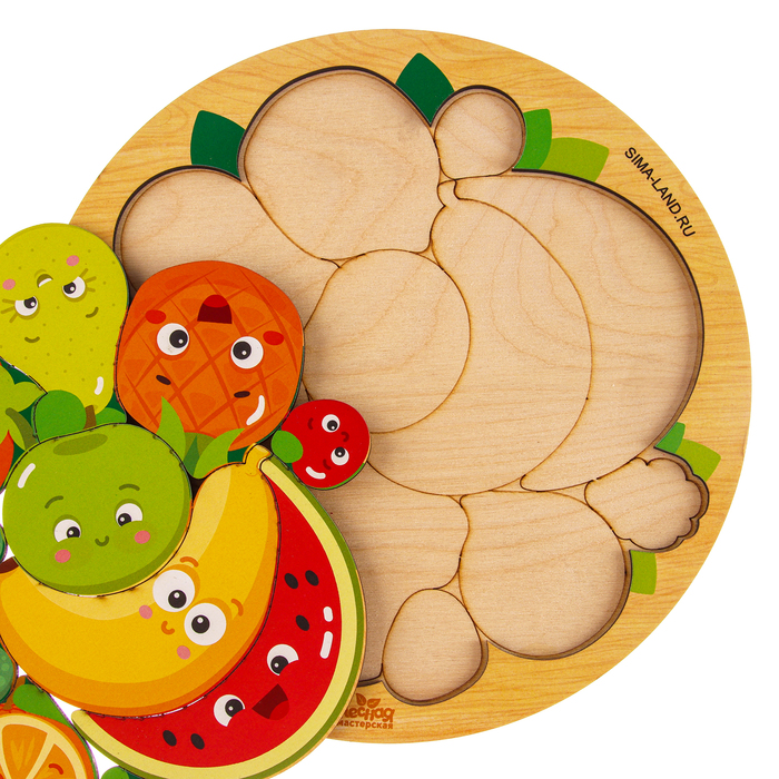 Определите с малышом положение фигурок и попросите ребёнка назвать каждую. Устройте фрукты на предназначенные им места — в этом помогут силуэты на основании игрушки.