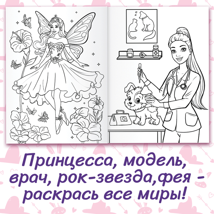 - 48 красочных картинок с принцессами, русалками, феями, моделями, рок-звездами, балеринами, спортсменками и другими очаровательными персонажами.