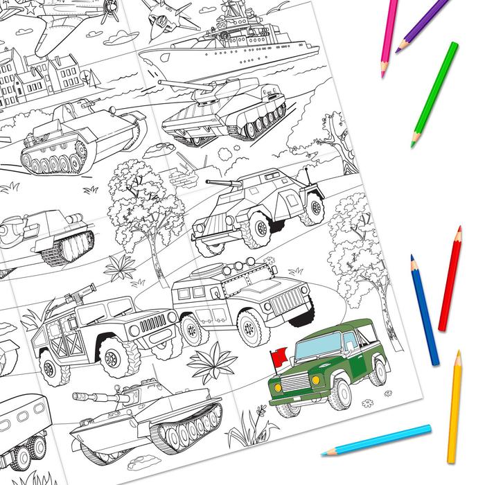Раскраска гигант «Военная техника» — это отличная возможность для детей весело провести время, развивая моторику и фантазию.
