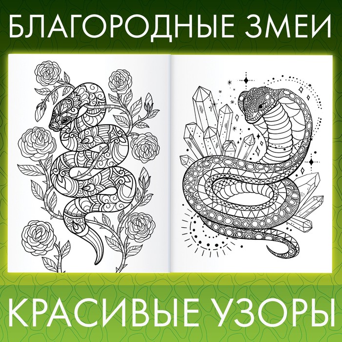 Раскраска-антистресс «Прекрасные и опасные змеи» — это настоящие открытие для людей, которые хотят расслабиться и погрузиться в мир собственной фантазии вместе с прекрсным символом 2025 года..