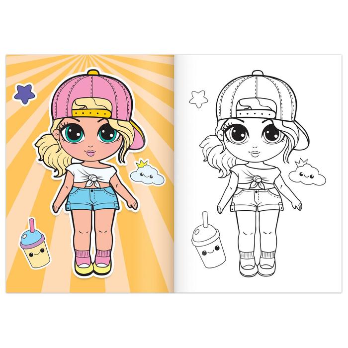 - 12 страниц с изображениями элегантных персонажей и креативных нарядов.