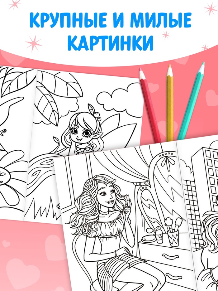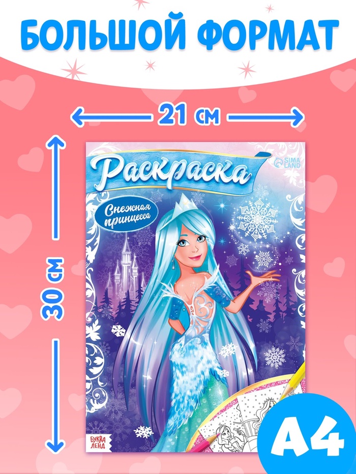 - Формат раскрасок А4, что позволяет брать раскраску с собой куда угодно и предоставляет возможность раскрашивать двум девочкам одновременно.
