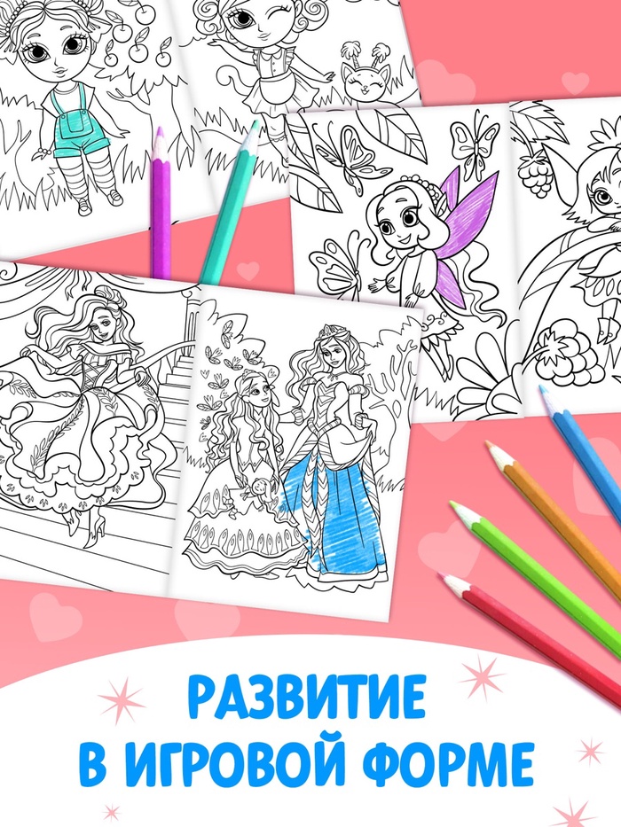 - Каждая картинка — это чистый холст для творческих идей! Кроха сможет придумать свои уникальные цветовые сочетания и создаст для каждой героини уникальный образ.