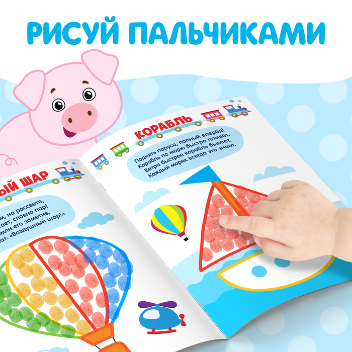 Книга «Рисуем пальчиками» имеет удобный формат для малыша, дополнена красочными картинками и интересными заданиями.