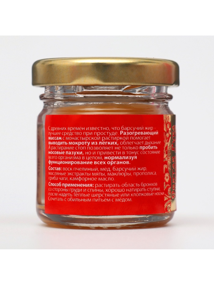 Состав: воск пчелиный, мёд, барсучий жир, масляные экстракты мяты, маклюры, прополиса, гриба чаги, камфорное масло.