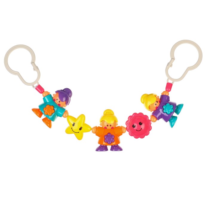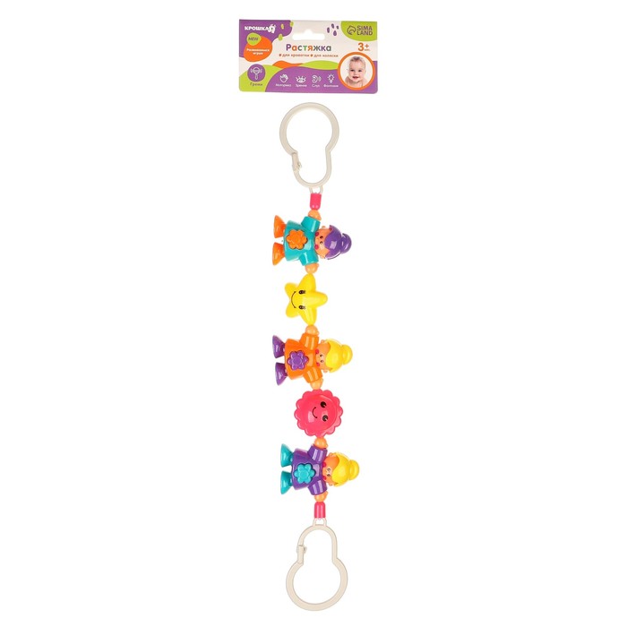 Яркая развивающая растяжка оснащена удобными креплениями, которые подойдут практически для любого типа коляски, кроватки и даже автокресла.