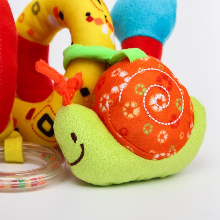 Игрушка-растяжка, которую можно подвесить на бортик детской кроватки или автокресло. Она растягивается, словно гармошка! К игрушке прикреплены развивающие элементы.Игрушка-растяжка сделана из тканей разного цвета и разной фактуры. Гладкие, ворсистые и вязаные ткани использованы при создании элементов игрушки для развития тактильных ощущений малыша.Изделие изготовлено из текстильных материалов с элементами пластмассы.