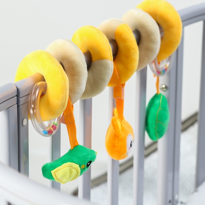 Мягкую и гибкую спиралевидную растяжку можно легко обмотать вокруг бортика кроватки, ручки автокресла, бампера коляски, разместить на шезлонг.
