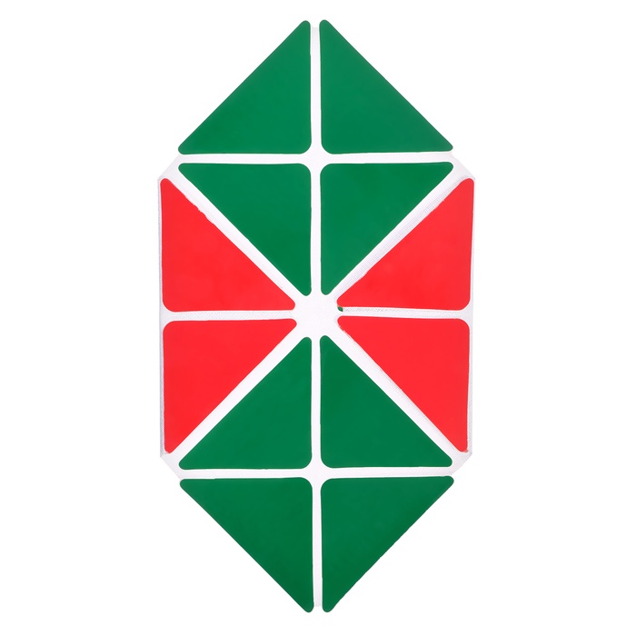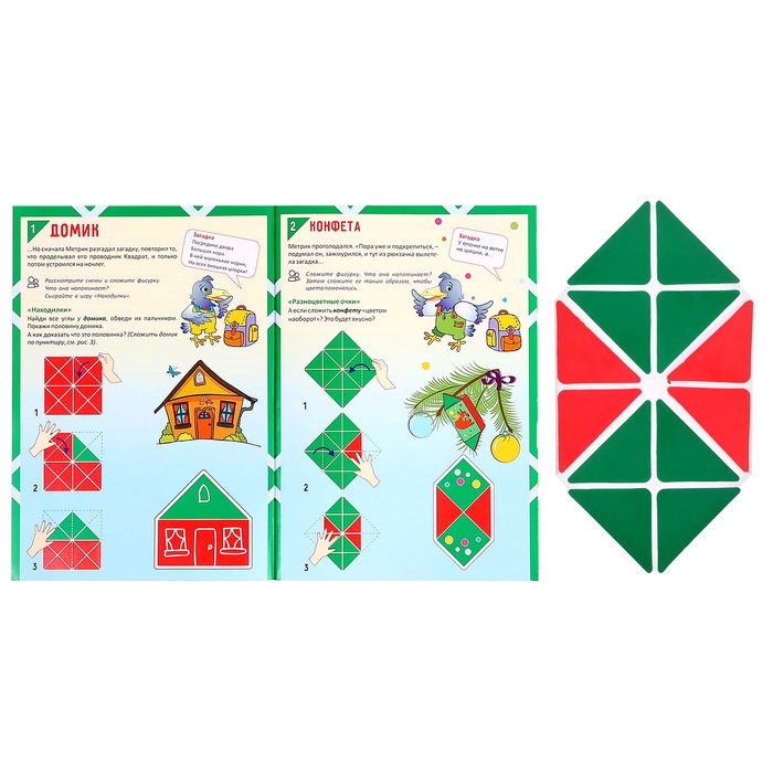 Развивающая игра представляет собой квадратное поле, включающее 16 равнобедренных треугольников размером 4,5 × 4,5 × 6 см. Они наклеены на гибкую тканевую основу на расстоянии 3–5 мм друг от друга. С одной стороны детали красного цвета, с другой — зелёного. Складывайте элементы по линиям сгиба в разных направлениях, составляйте геометрические и предметные фигуры по схеме в альбоме или придумывайте собственные. Научите ребёнка объёмному конструированию. Делайте у деталей разрезы в определённых местах, указанных в приложении, и создавайте пространственные фигуры. Этот дидактический материал знакомит детей с основами геометрии, стереометрии, моделирования и счётом.