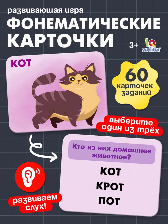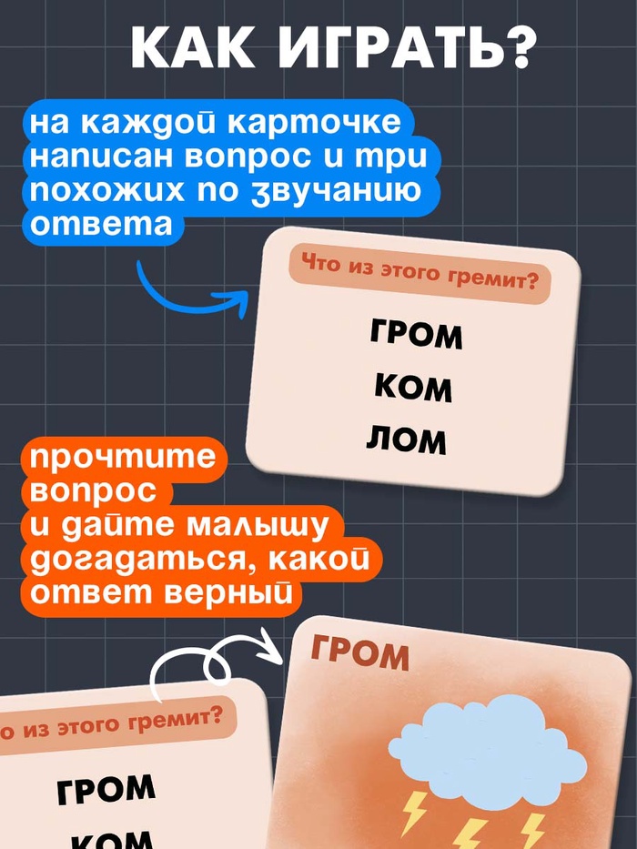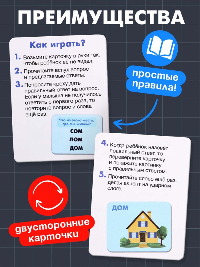 Карточки тренируют внимание, память и умение сопоставлять информацию. Вопросы построены так, чтобы ребёнок задействовал логическое мышление и слуховое восприятие. Эта игра — простой и эффективный способ подготовки к школе.