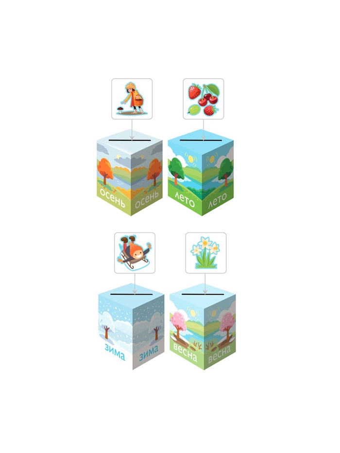 Разложите карточки перед ребёнком и предложите распределить их по коробочкам, соответствующим временам года. Обсуждайте каждое изображение — так малыш запомнит больше деталей. Игра подходит для индивидуальных и групповых занятий, а компактный размер позволяет брать её в дорогу.