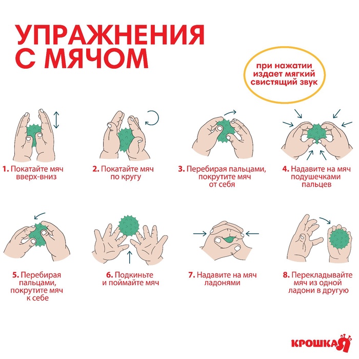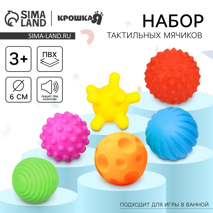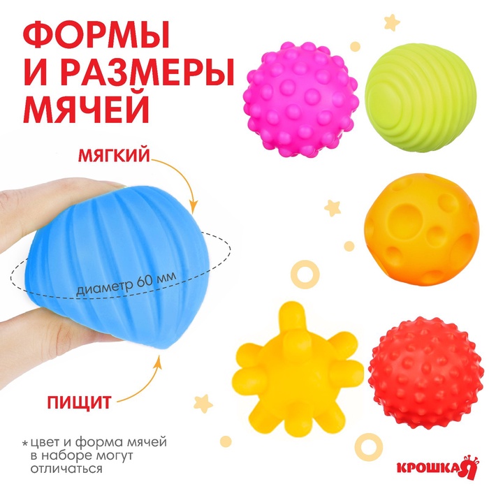 Мячики с рельефной массажной поверхностью способствуют развитию мелкой моторики и тактильных ощущений. Давление на фактурную поверхность мячиков стимулирует и благоприятно воздействует на нервные окончания, ответственные за большинство процессов в организме. Шарики имеют яркие цвета, которые способствуют развитию зрения, а пищалка внутри развивает слуховое восприятие.