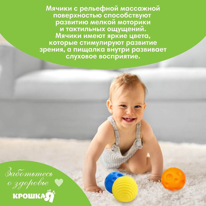 Мячики с рельефной массажной поверхностью способствуют развитию мелкой моторики и тактильных ощущений. Давление на фактурную поверхность мячиков стимулирует и благоприятно воздействует на нервные окончания, ответственные за большинство процессов в организме. Шарики имеют яркие цвета, которые способствуют развитию зрения, а пищалка внутри развивает слуховое восприятие.