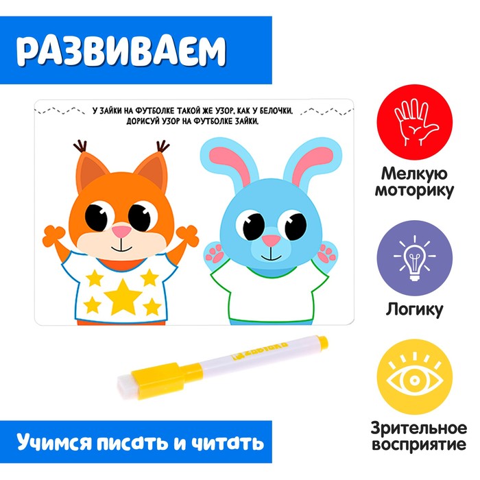 Развивающий набор «Дорисуй картинку» направлен на развитие мелкой моторики и подготовку руки к письму. Внутри вы найдёте 4 разноцветных маркера и карточки с 20 интересными заданиями.