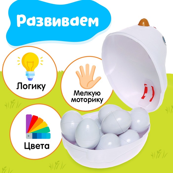 Развивающий набор «Курочка-наседка» поможет малышу в лёгкой игровой форме выучить основные цвета, геометрические фигуры и фрукты.