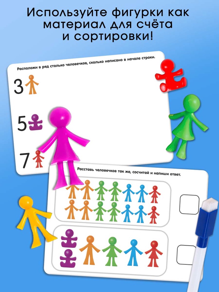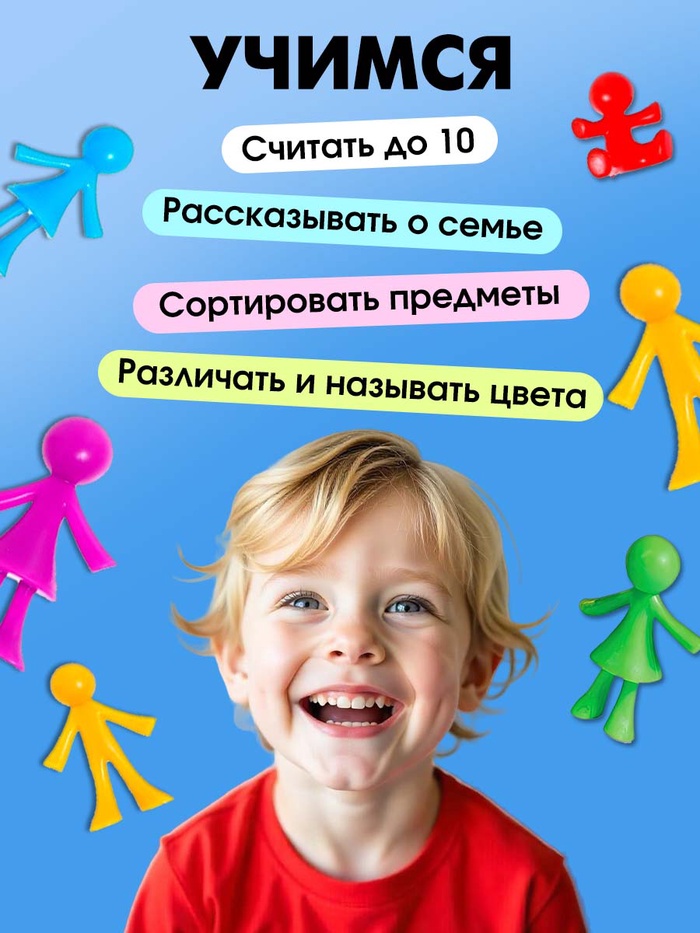 С развивающим набором «Наша семья» ребёнок в лёгкой игровой форме научится считать, распределять по цветам и классифицировать фигурки по разным признакам.