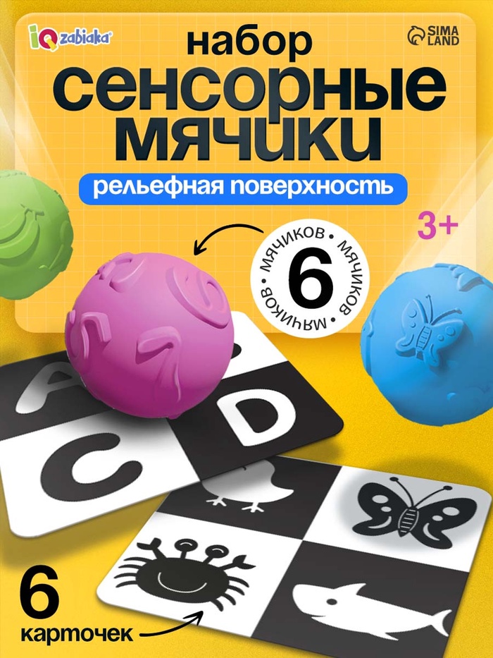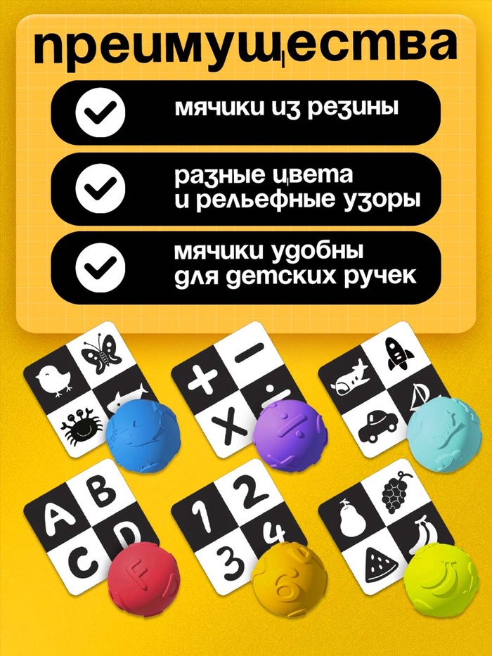 Внутри вы найдёте 6 чёрно-белых карточек и 6 цветных мячиков.