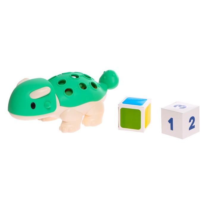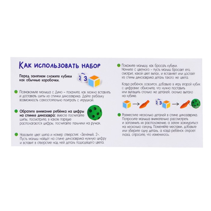 Внутри вы найдёте забавного динозаврика, 12 шипов и 2 кубика для занятий.