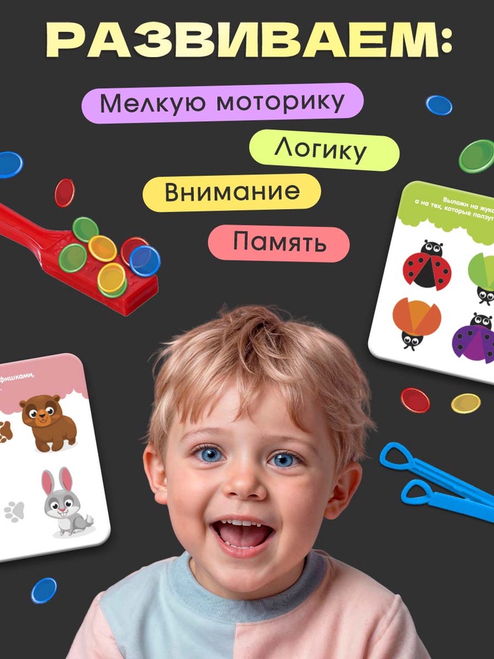 В комплекте представлено 100 магнитных фишек и 10 логических заданий. Такая игра способствует развитию у ребёнка мелкой моторики, логики, внимания и памяти. Он познакомится с цветами, научится считать и свободно управлять пинцетом!