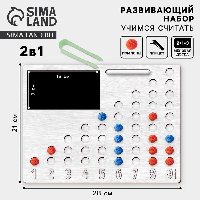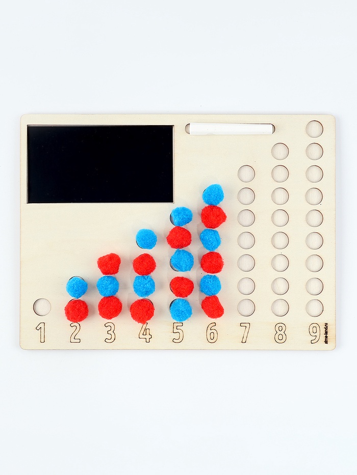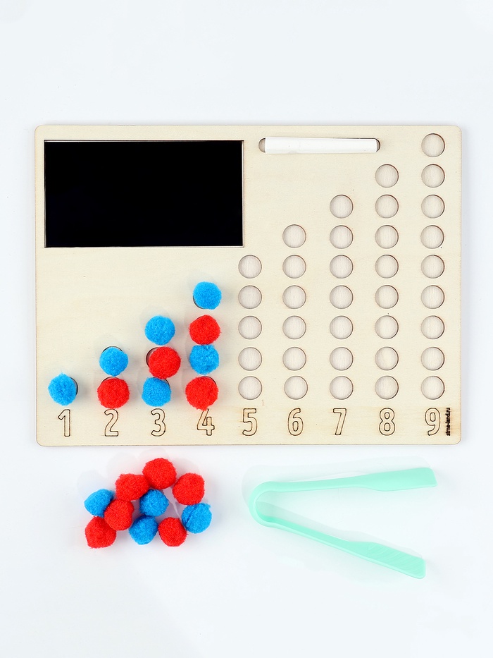 Играя с набором, ребёнок не только учится считать, но и развивает логическое мышление, знакомится с цветами и формами. Меловое поле позволяет родителям или педагогам писать примеры, а ребёнок с помощью шариков и пинцета находит правильный ответ. Это делает процесс обучения интерактивным и интересным.