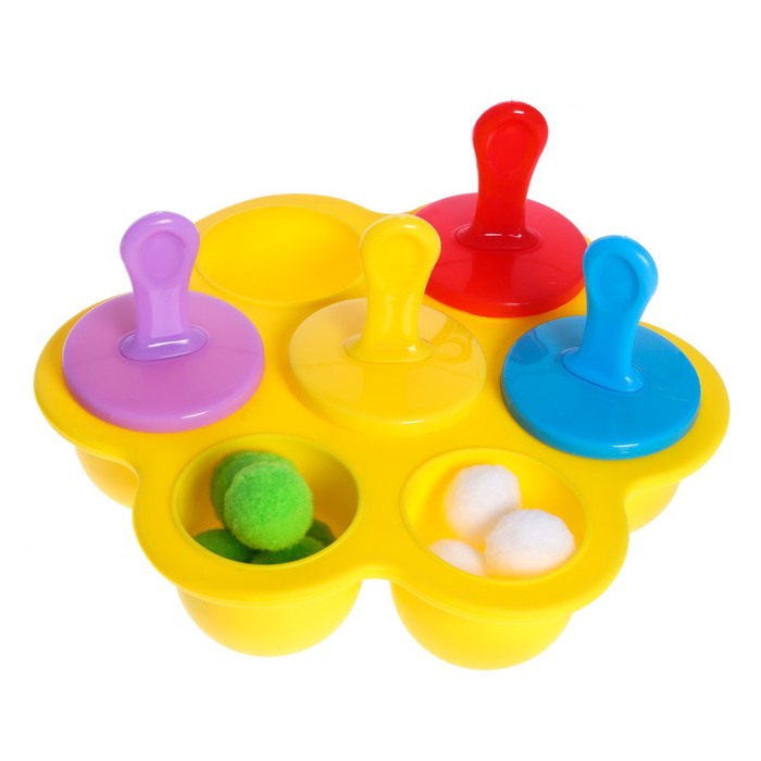 - После этого назовите малышу какой-нибудь из плодов и попросите определить его цвет, пусть ребёнок положит в сортер бомбошку такого же цвета в нужный отсек.