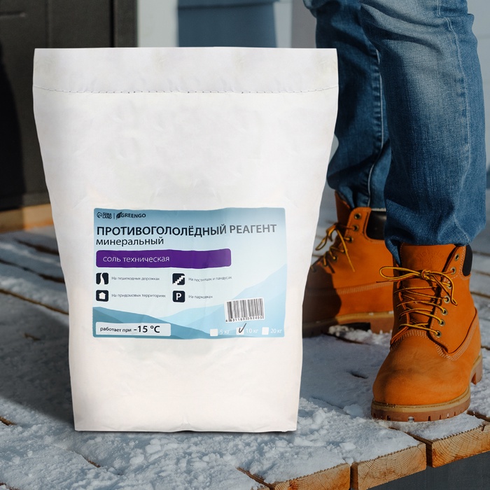 - Техническая соль разрушает лёд при температуре до -15 °С и длительное время препятствует образованию снежного наката.