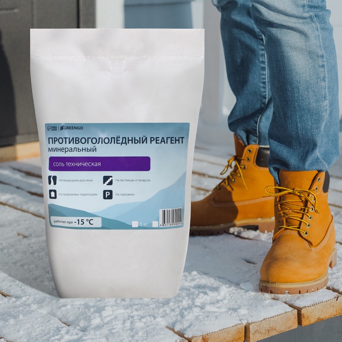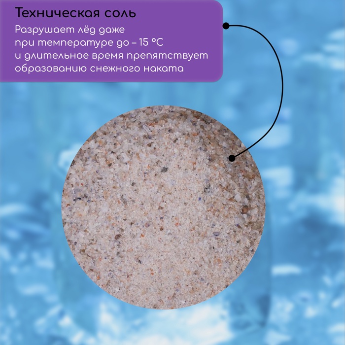 - Техническая соль разрушает лёд при температуре до -15 °С и длительное время препятствует образованию снежного наката.