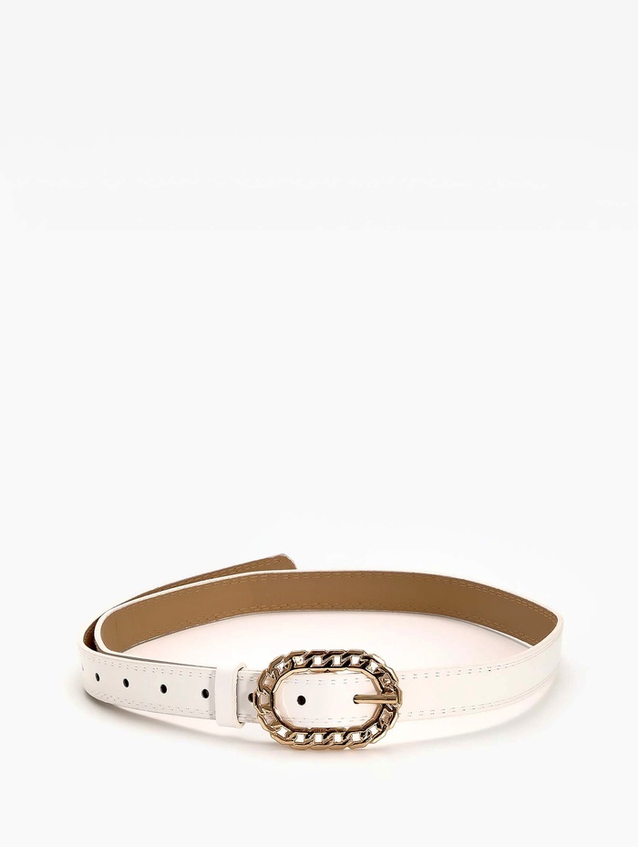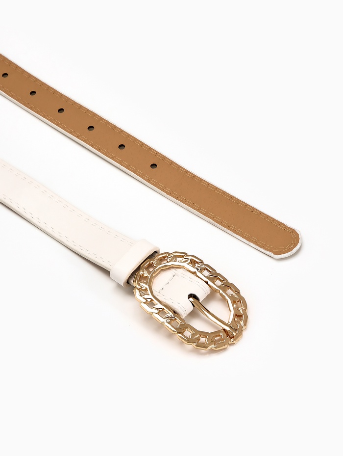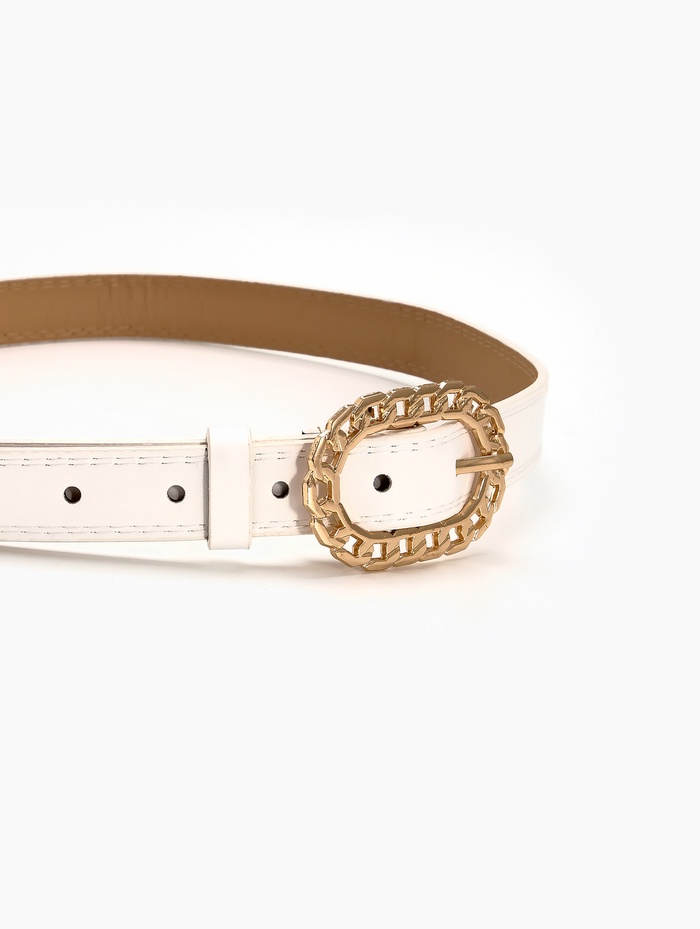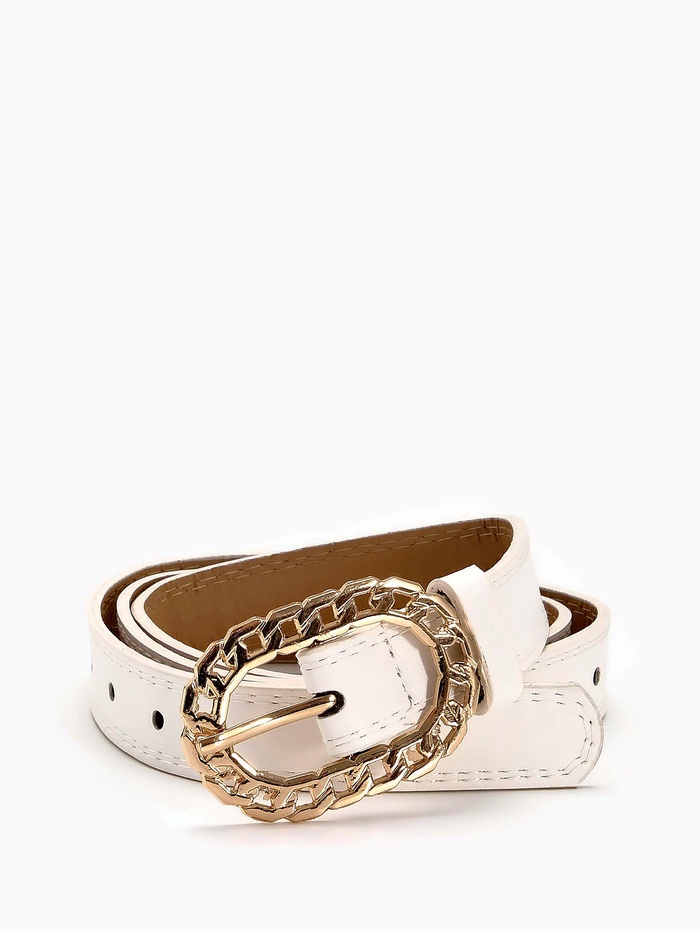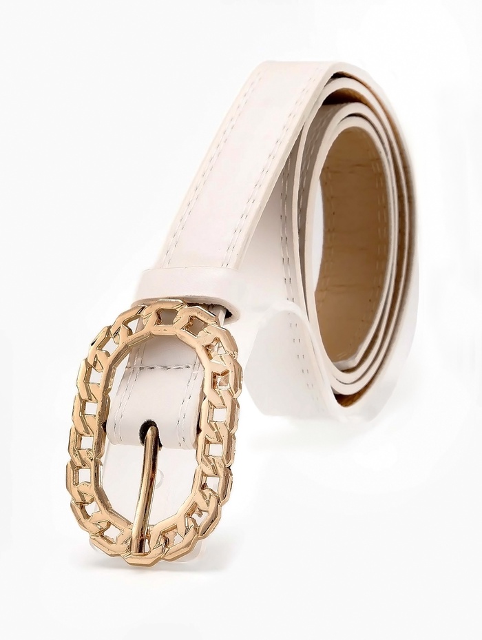 Белый ремень становится связующим элементом между светлыми и пастельными тонами в гардеробе. Он сочетается с летними платьями, льняными брюками и джинсами, добавляя образу структуру. Золотая пряжка создает гармоничный акцент с тёплыми металлическими деталями бижутерии, объединяя элементы комплекта.