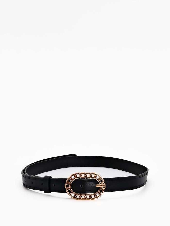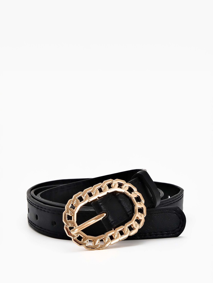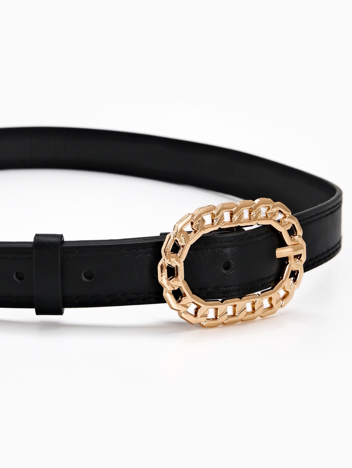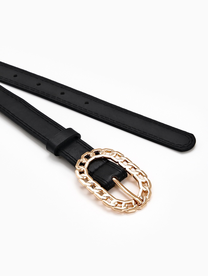 Женский ремень чёрного цвета с золотой пряжкой имеет классическую ширину 2,5 см, которая подходит для повседневной носки. Модель сохраняет лаконичный силуэт, мягко подчёркивая линию талии. Золотистая фурнитура добавляет акцент, не перегружая образ.