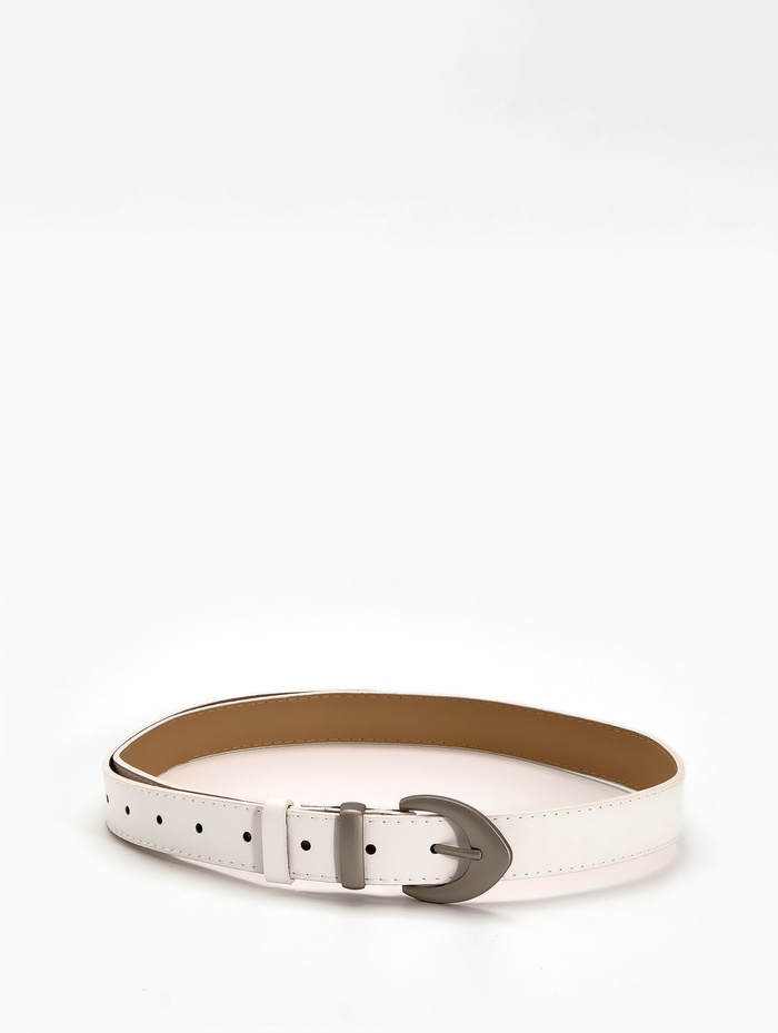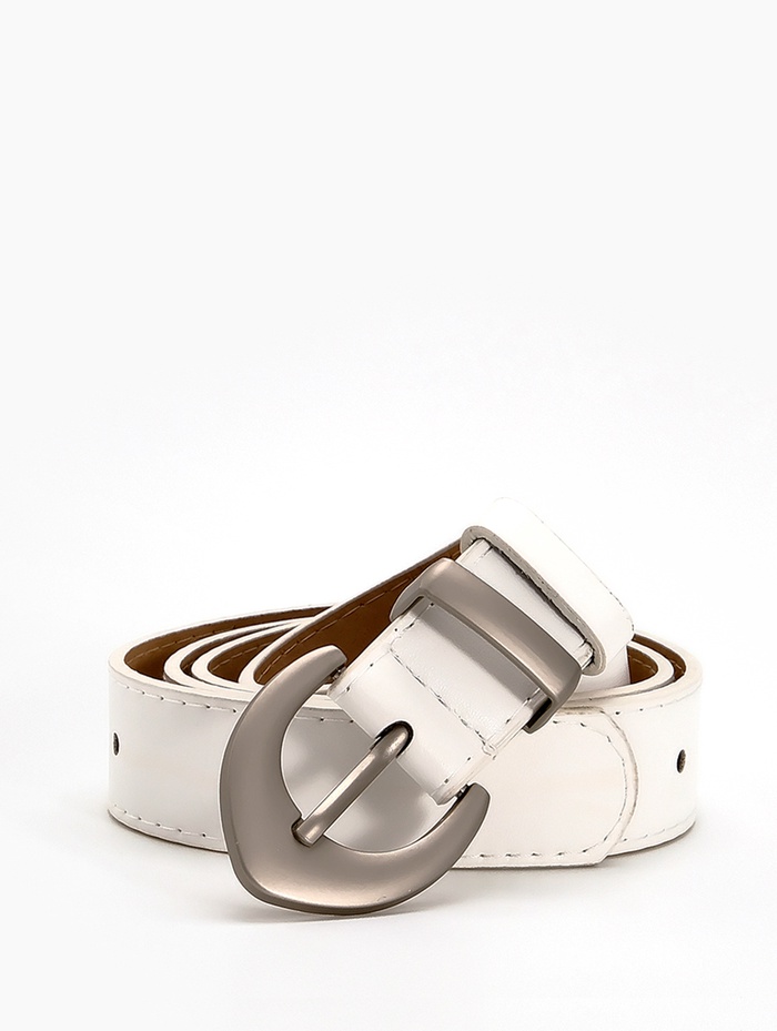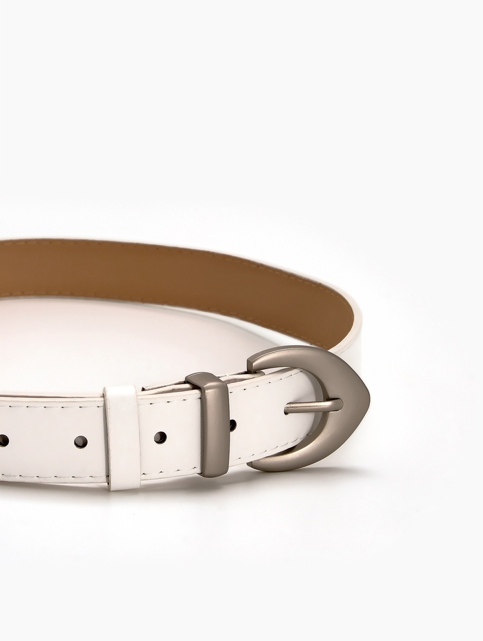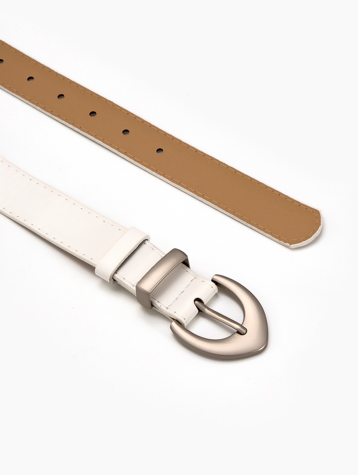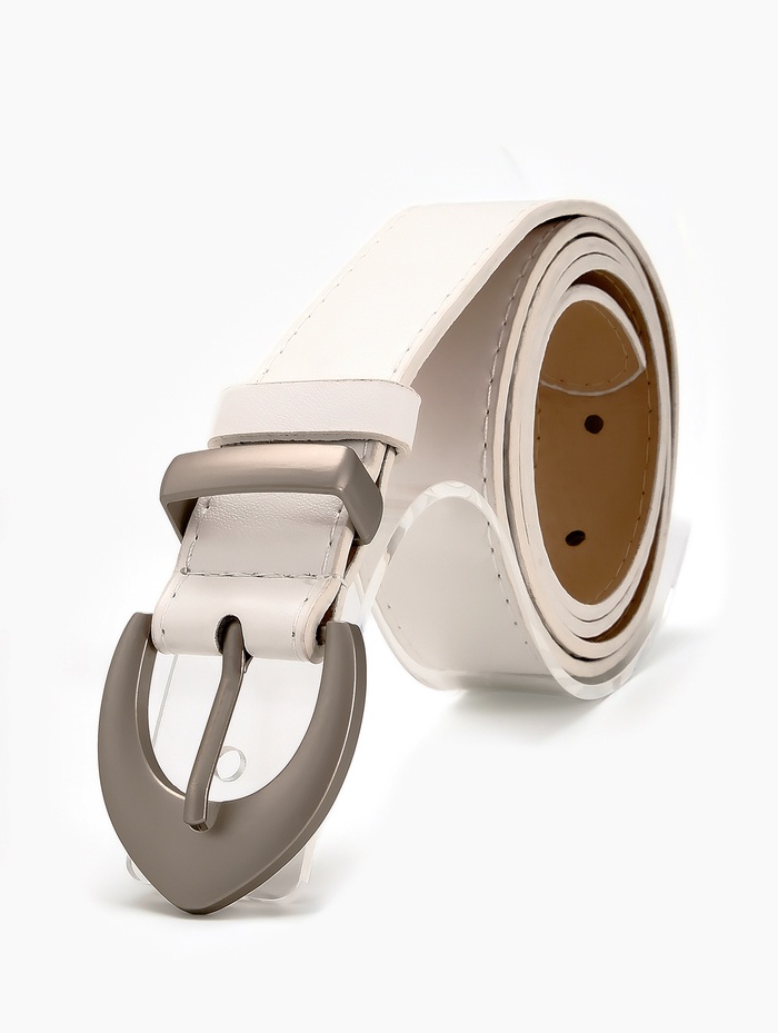 Белый ремень с матовой серебряной пряжкой добавляет в образ свежесть и легкость. Ширина 3 см мягко определяет линию талии, не создавая излишнего давления. Матовая фурнитура придает современное звучание, сочетаясь с серебряными аксессуарами.