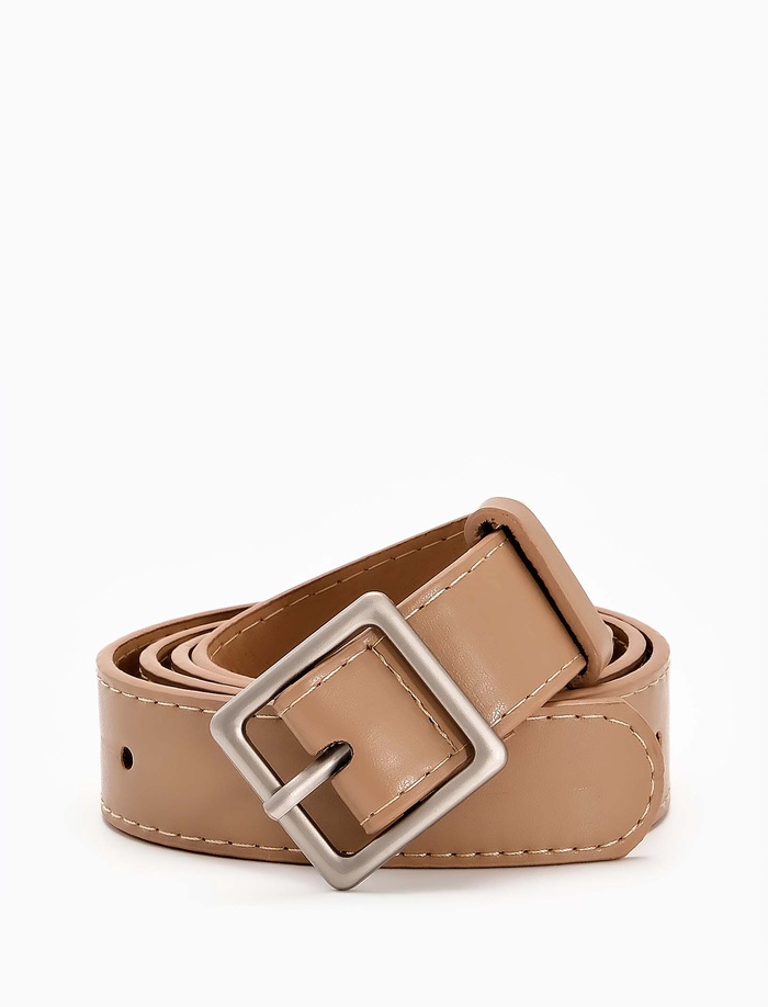 Бежевый женский ремень с матовой серебряной пряжкой легко сочетается с разными оттенками в гардеробе. Нейтральный цвет создает плавный переход между элементами образа, а матовая фурнитура добавляет современный акцент. Ширина 3 см мягко подчеркивает талию, сохраняя комфорт при повседневной носке.