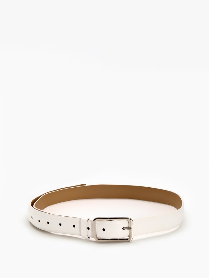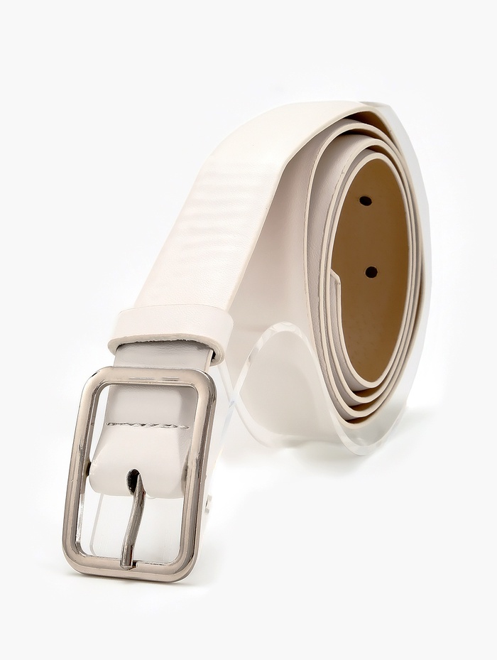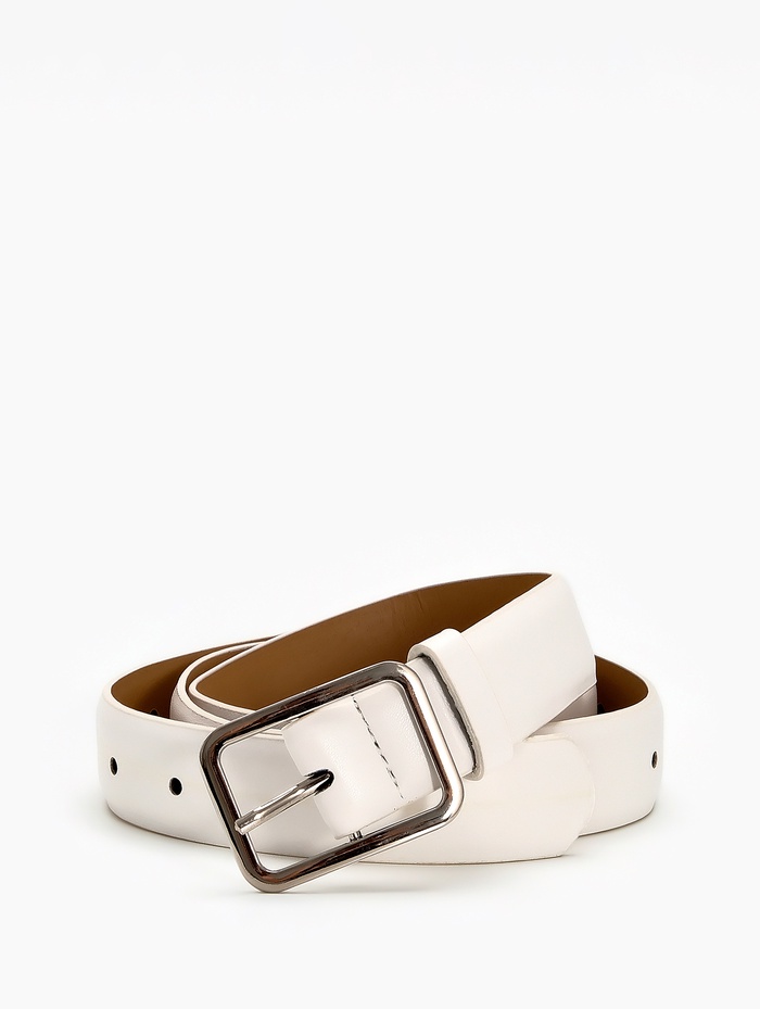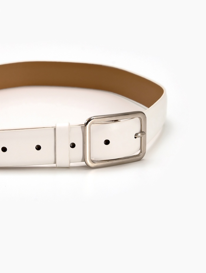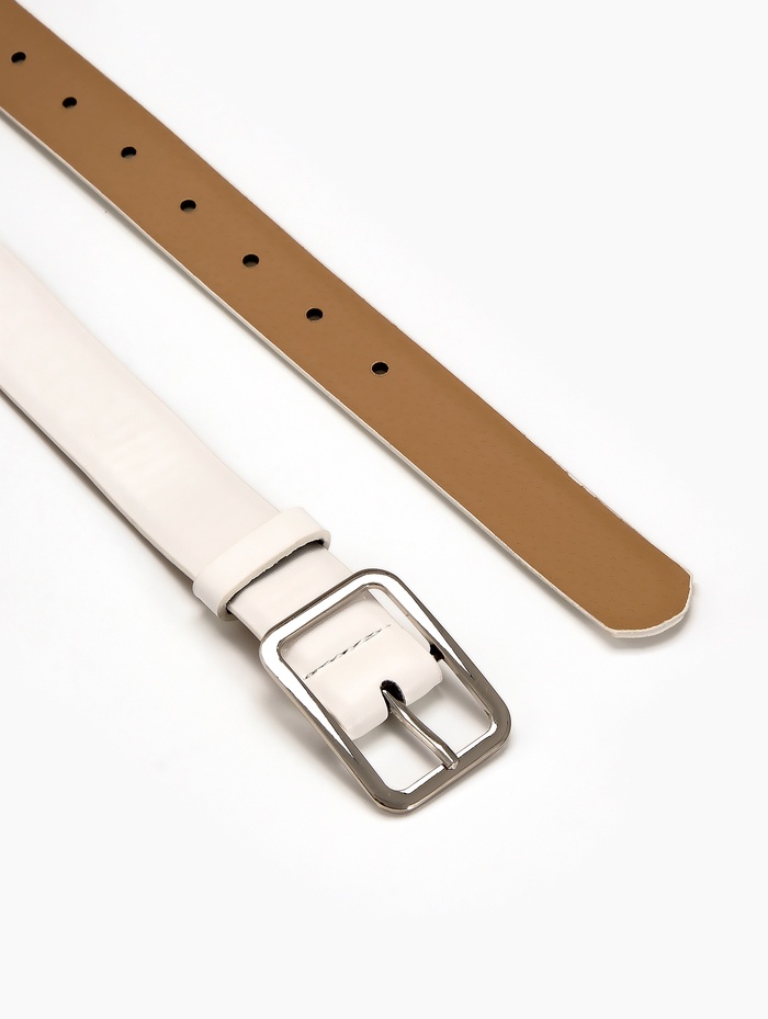Белый ремень сочетается с летними платьями, льняными брюками и светлыми комплектами. Матовая поверхность пряжки создает сдержанный акцент, который не конфликтует с другими металлическими элементами. Ширина 3 см обеспечивает четкий силуэт, сохраняя легкость летнего образа.