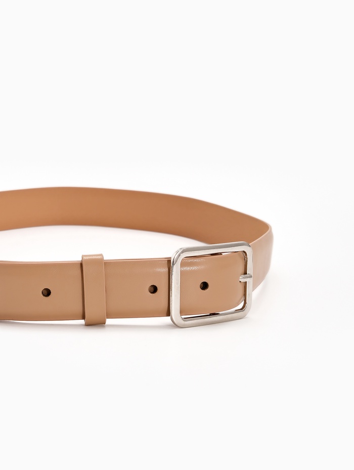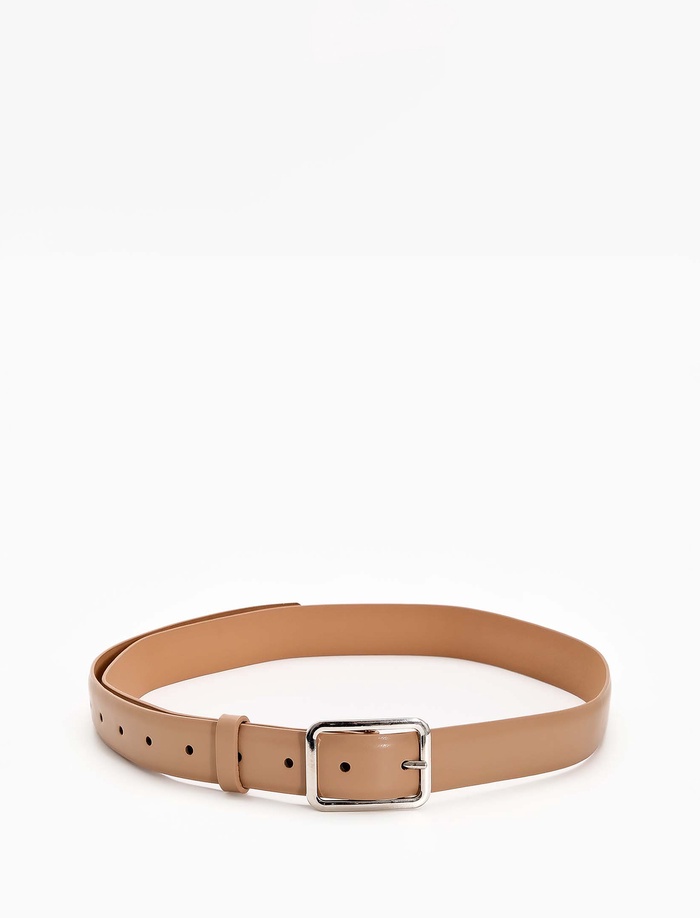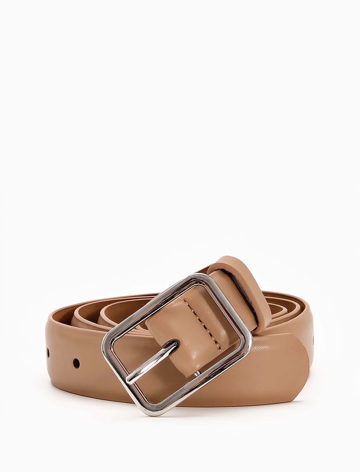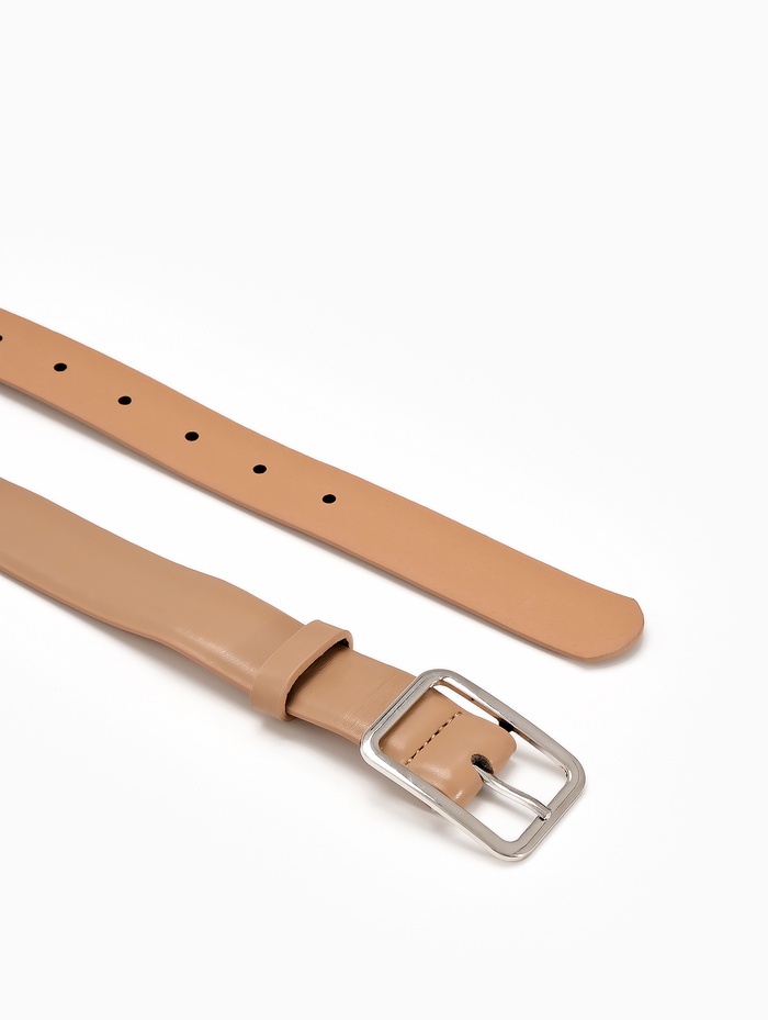 Бежевый ремень объединяет элементы светлой и темной одежды в целостный образ. Матовая поверхность пряжки создает современный акцент, который сочетается с серебряными украшениями. Ширина 3 см обеспечивает четкий силуэт, сохраняя баланс в повседневных и деловых комплектах.
