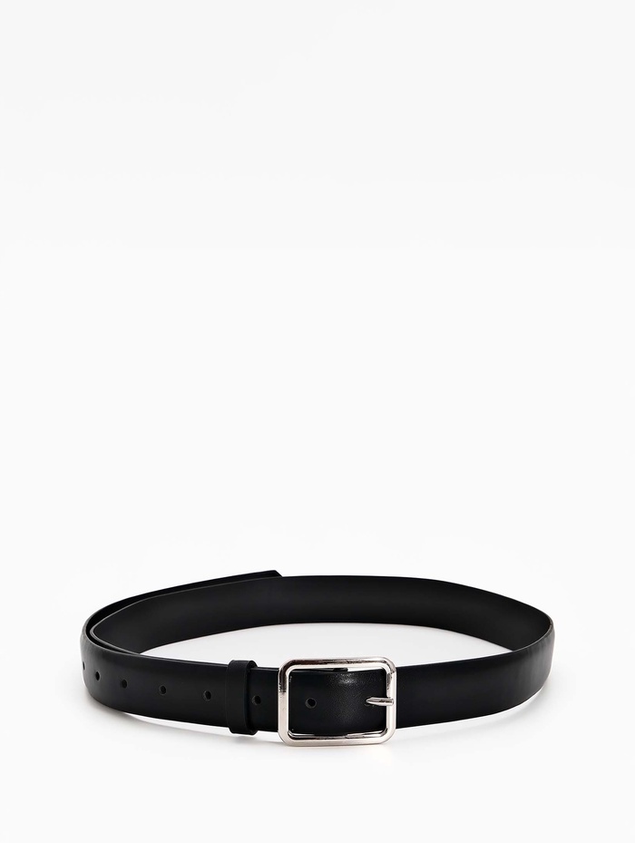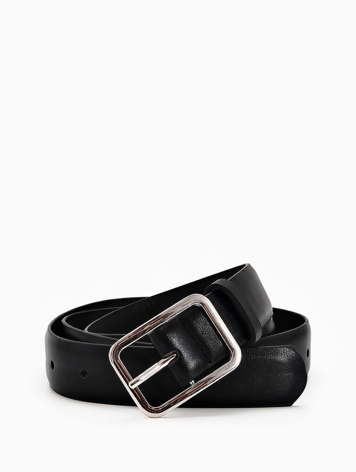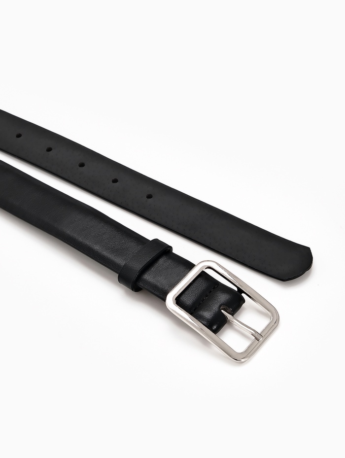 Женский ремень черного цвета с пряжкой из матового металла создает сдержанный и современный образ. Ширина 3 см мягко подчеркивает линию талии, сохраняя комфорт в течение дня. Матовая фурнитура добавляет аксессуару тактильную выразительность, сочетаясь с украшениями в холодной гамме.
