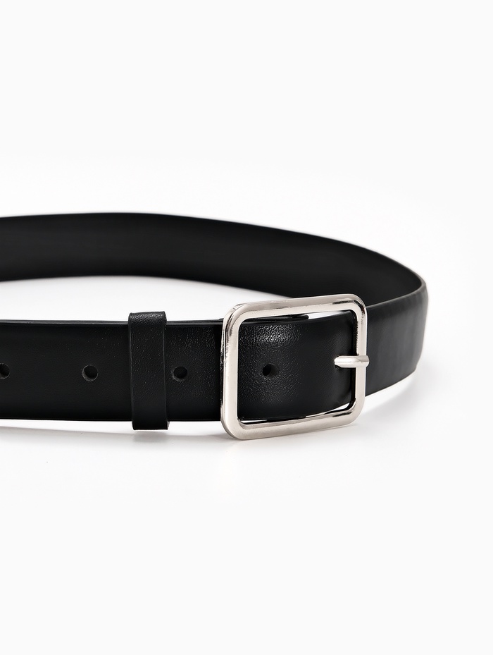 Ремень сочетается с брючными костюмами, платьями-футлярами и джинсами. Матовая поверхность пряжки создает современный акцент, который не конфликтует с другими металлическими деталями. Ширина 3 см обеспечивает четкий силуэт, сохраняя пропорции в деловом и повседневном стиле.