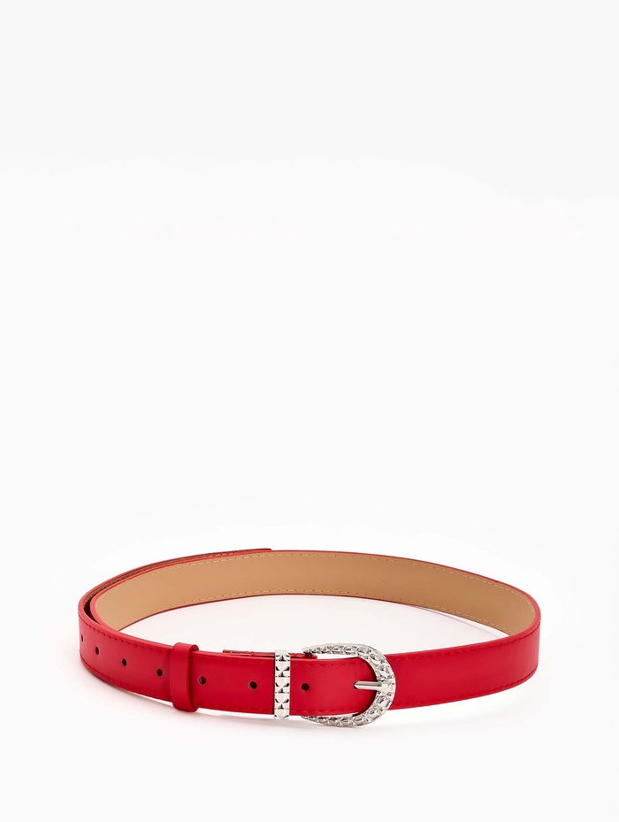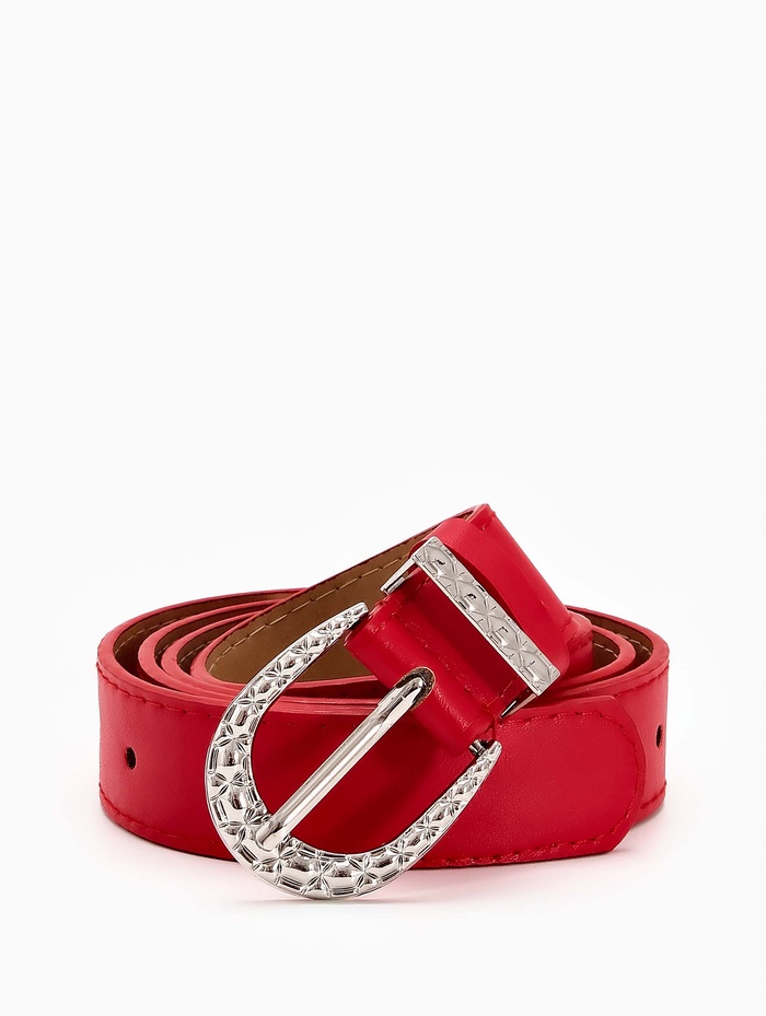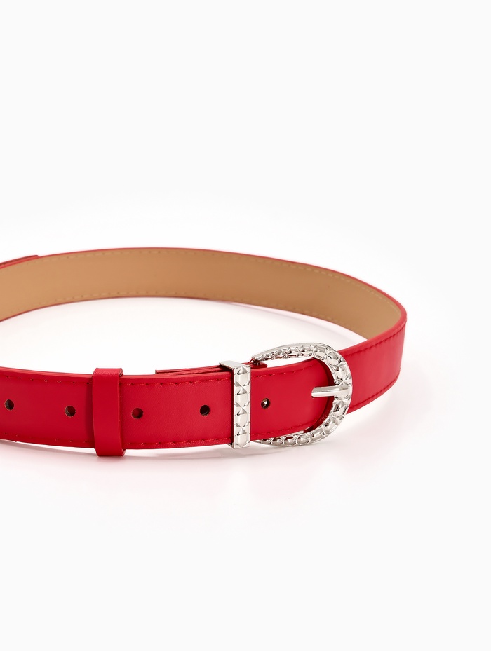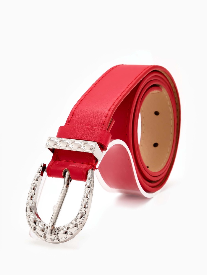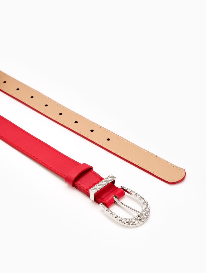 Красный ремень с серебряной пряжкой создает выразительный акцент в вашем гардеробе. Насыщенный цвет привлекает внимание, а лаконичный дизайн сохраняет универсальность. Ширина 3 см мягко подчеркивает талию, сохраняя комфорт при повседневной носке.