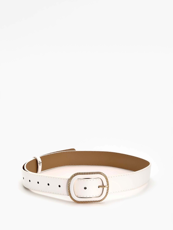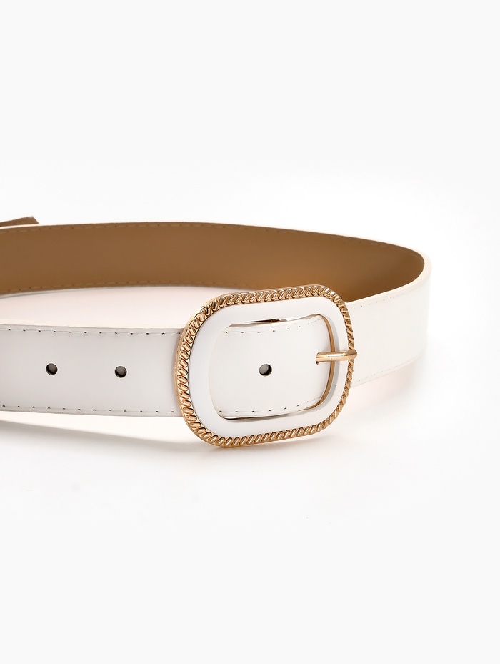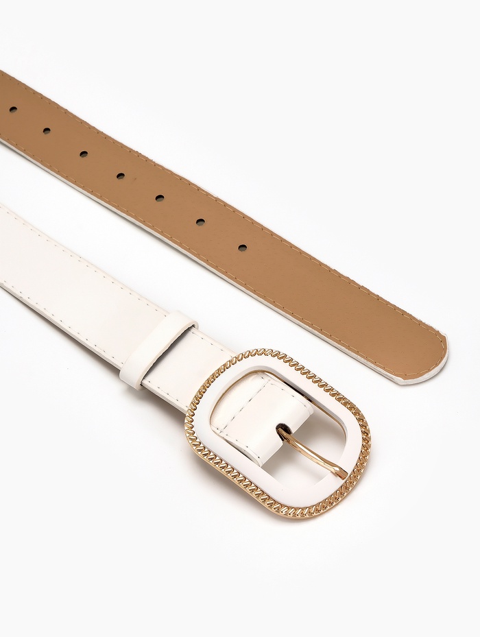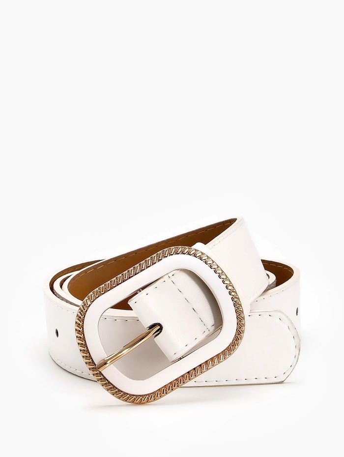Белый ремень легко становится центральным элементом летних и вечерних комплектов. Он сочетается с пастельными и яркими оттенками, добавляя образу завершенность. Комбинированная пряжка создает интересный акцент, который гармонирует с золотыми украшениями, сохраняя ощущение легкости.