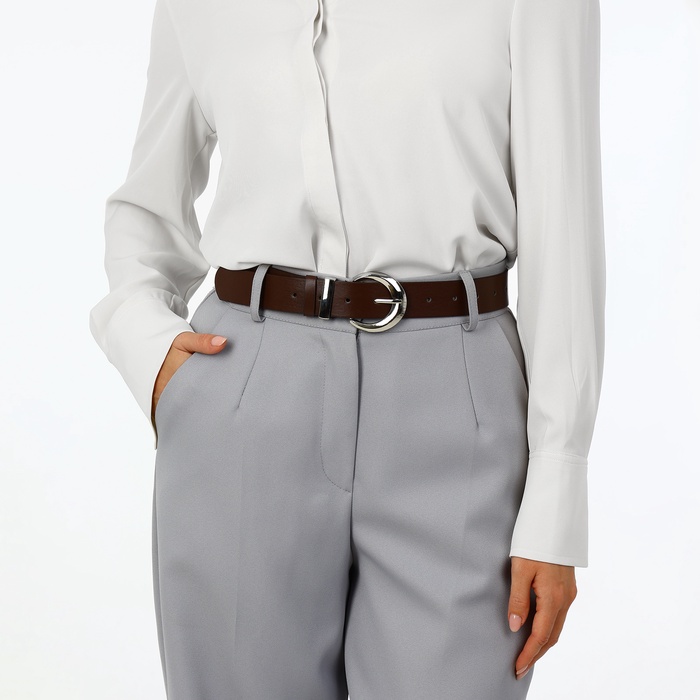 Этот женский ремень — лаконичный акцент, завершающий образ. Коричневый тон сочетается с палитрой от джинсов до платьев, а серебристая пряжка добавляет строгой элегантности. Универсальная ширина 3.3 см гармонично смотрится и с брюками, и с юбкой.