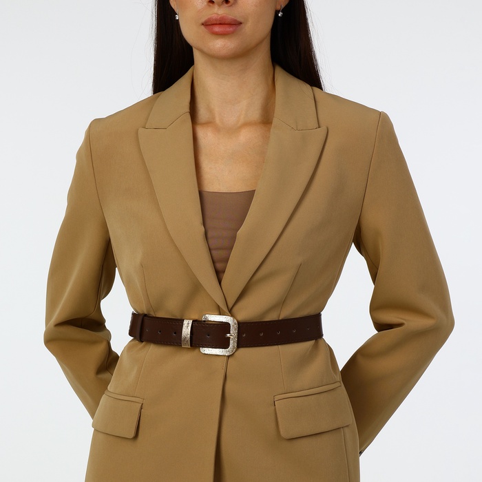 Коричневый женский ремень с золотистой пряжкой — универсальный аксессуар для гардероба. Классическое сочетание оттенков подходит к разным стилям одежды: от джинсов до платьев. Винтовой механизм пряжки обеспечивает точную регулировку, помогая подчеркнуть линию талии и сохранить комфорт в течение дня.