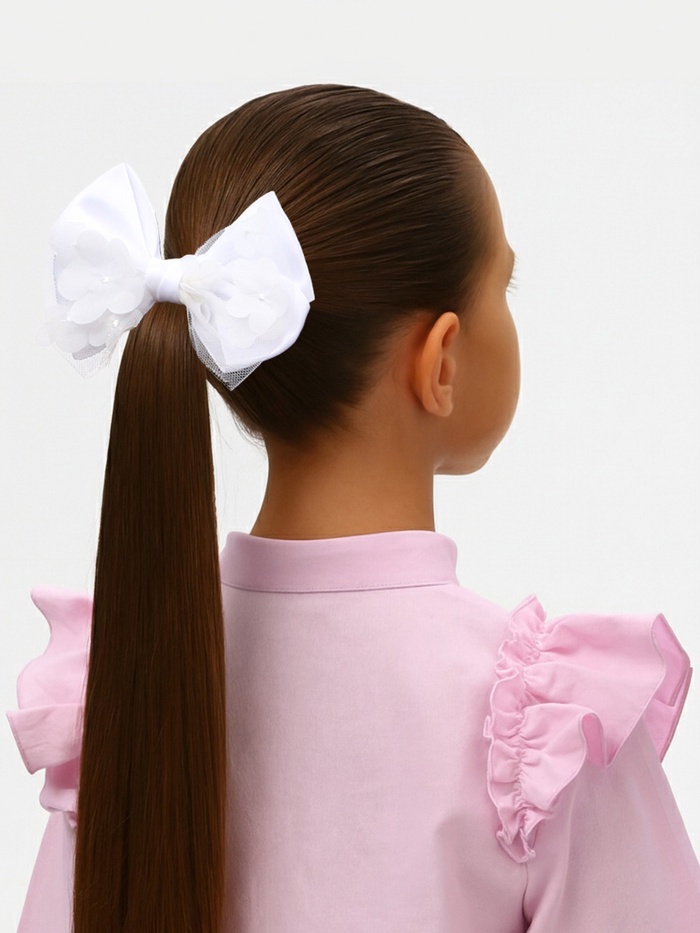 - Удобство и практичность: компактный и легкий аксессуар надежно держит волосы, не оставляя заломов и не повреждая их структуру, что особенно важно для нежных волос ребенка.