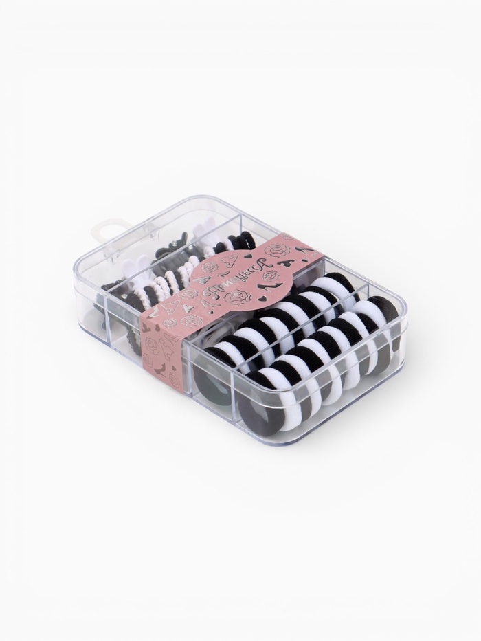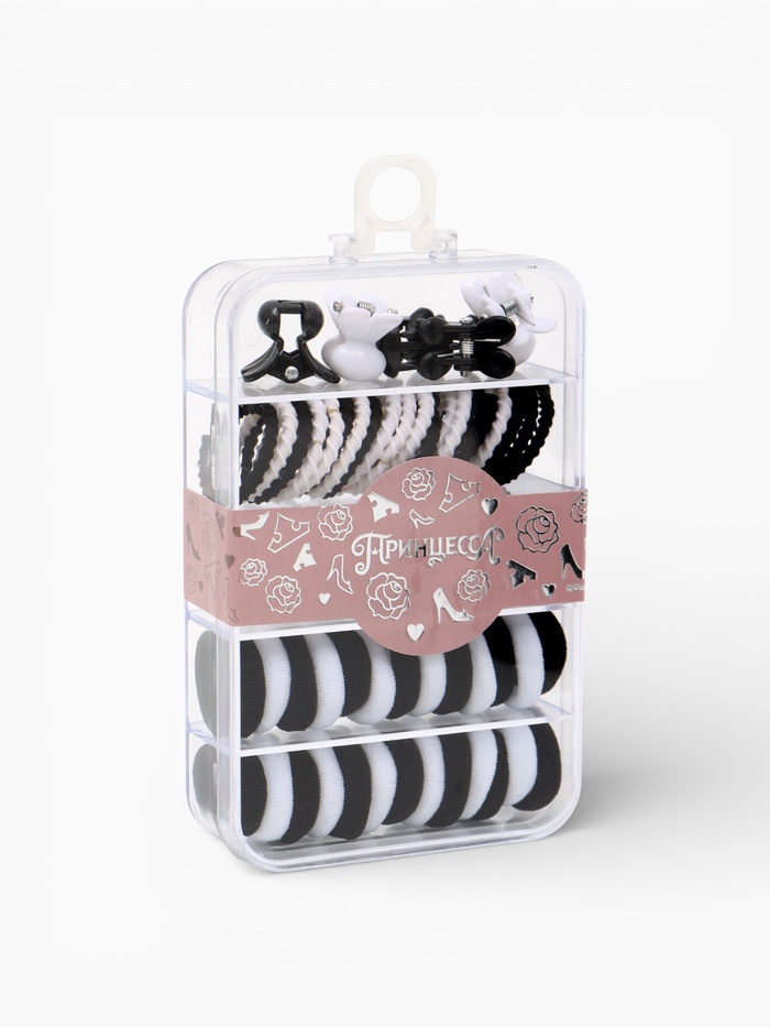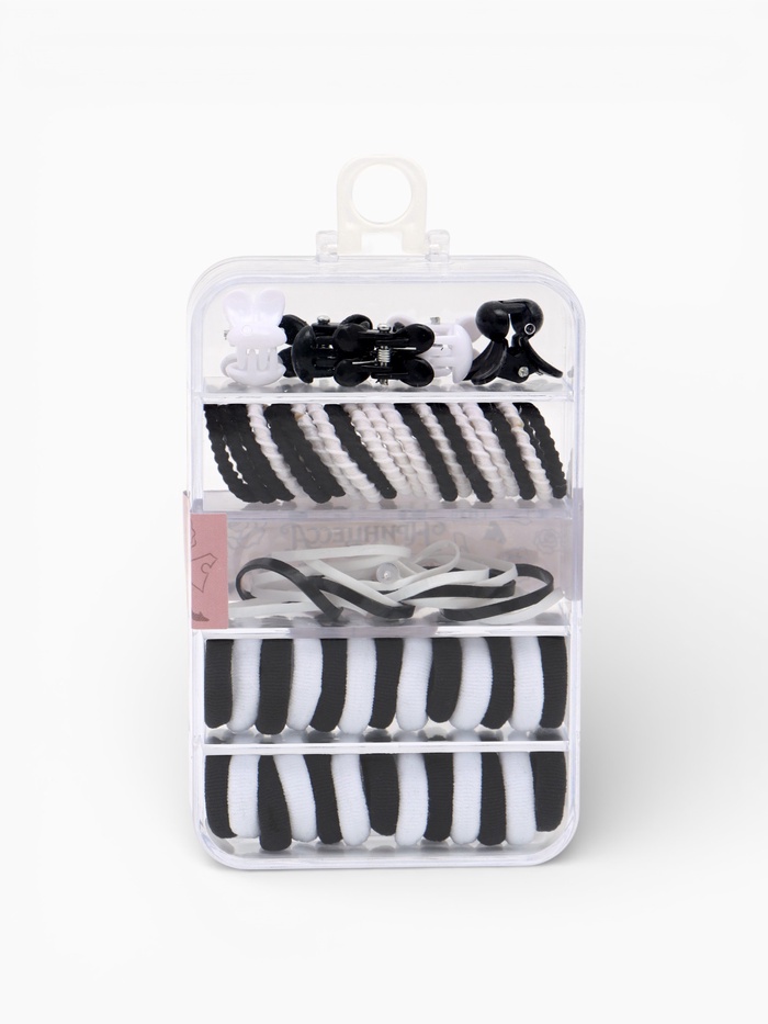Удобный набор аксессуаров для девочек от 3 лет — всё собрано в одном компактном контейнере с крышкой и ручкой для переноски. Включает 3 вида резинок и заколок.