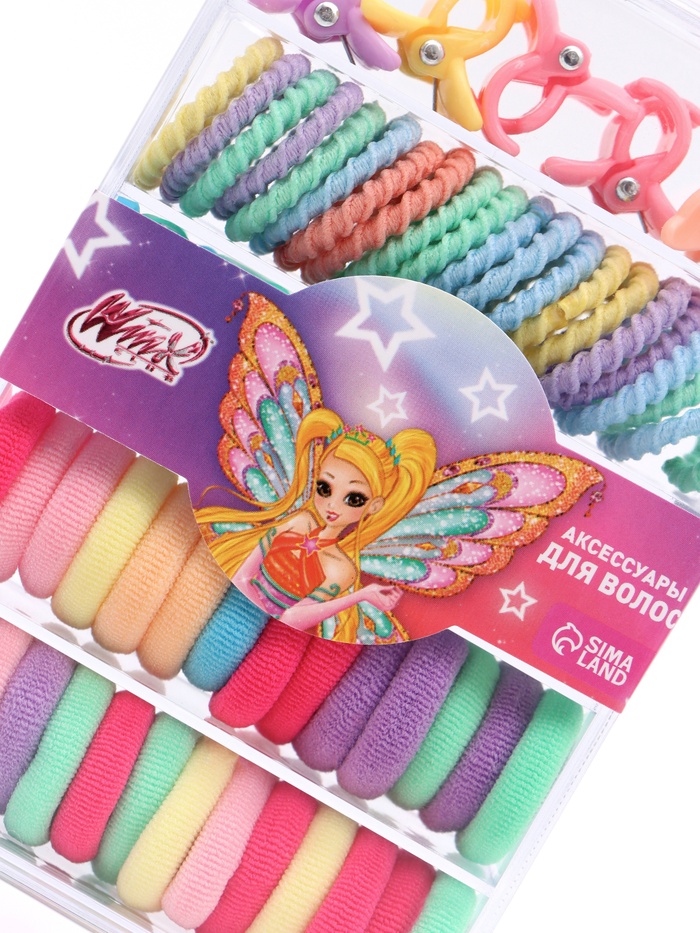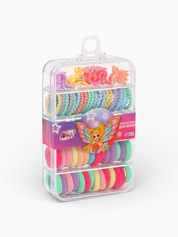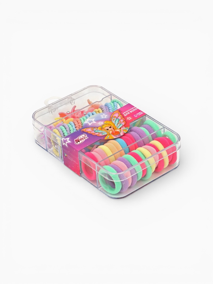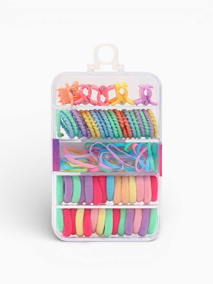 Удобный набор аксессуаров для девочек от 3 лет — всё собрано в одном компактном контейнере с крышкой и ручкой для переноски. Включает 3 вида резинок и заколок.