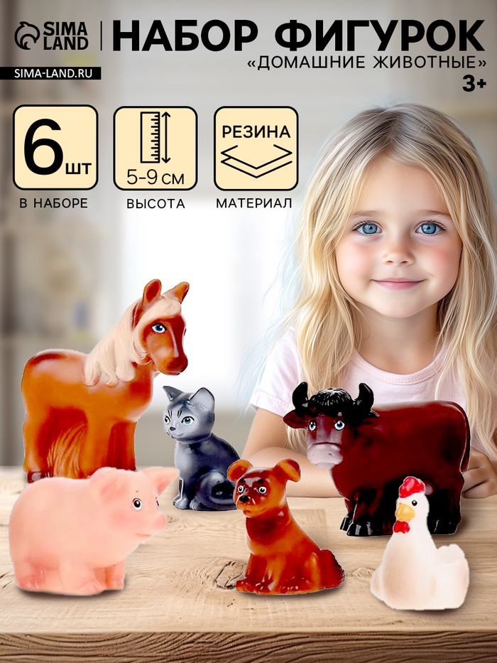 «Домашние животные» — набор игрушек из ПВХ. В наборе представлено шесть различных игрушек, включающих лошадь, свинью, корову, собаку, кошку и курицу. Размер набора в упаковке составляет 21 см, что делает его удобным для игры дома, в машине или во время отдыха на природе.