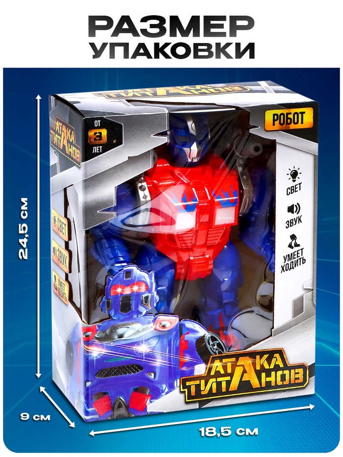 Невероятные возможности робота пробудят фантазию ребёнка и сделают сюжеты разнообразнее и увлекательнее. Вставьте в устройство 2 батарейки типа АА (в комплект не входят), и робот пойдёт вперёд, при этом защитник будет двигать руками, шевелить головой, ярко светить глазами и издавать звуки выстрелов.
